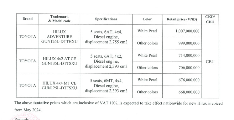 Hà Nội, ngày 01/3/2024, Toyota Việt Nam (TMV) đã công bố sự trở lại của dòng bán tải Toyota Hilux nhập khẩu nguyên chiếc từ Thái Lan với mức giá vô cùng hấp dẫn chỉ từ 668 triệu đồng.Ngoài ra,mẫu xe Toyota Hilux còn được trang bị thêm hàng loạt tiện nghi và tính năng an toàn mới.Giá cụ thể như sau: